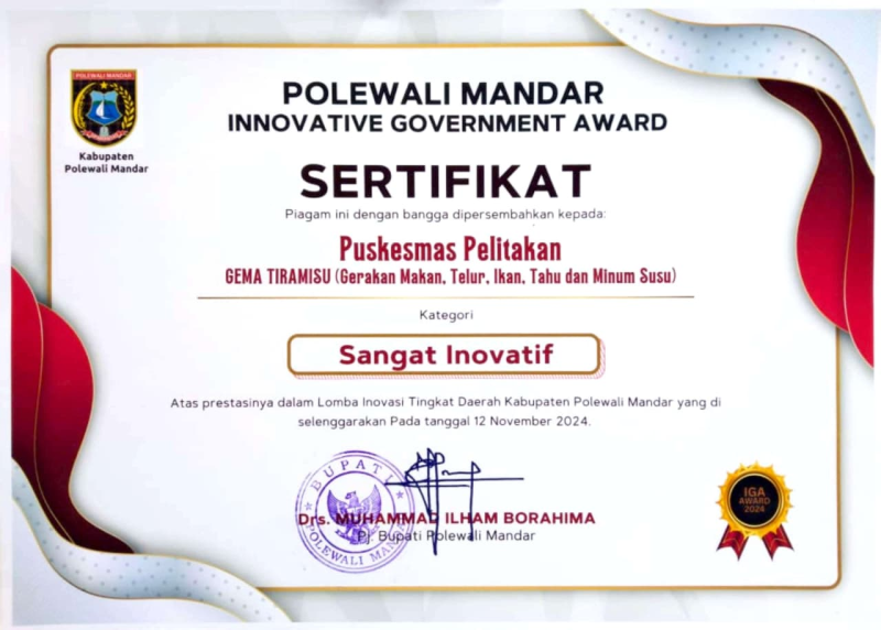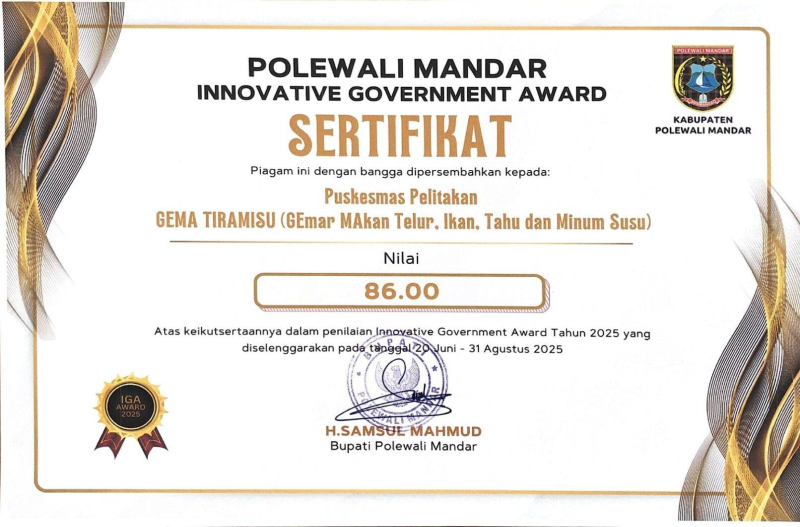 Pada tahun 2025, inovasi GEMA TIRAMISU kembali memperoleh sertifikat/piagam penghargaan dari IGA (Innovative Government Award) Polewali Mandar dengan nilai 86,00, yang diselenggarakan pada periode 20 Juni hingga 31 Agustus 2025. Capaian ini menunjukkan bahwa inovasi tersebut dinilai layak, berkelanjutan, serta berkontribusi positif sebagai langkah awal dalam pencegahan stunting di wilayah kerja UPTD Puskesmas Pelitakan, khususnya pada kelompok sasaran bayi dan balita.